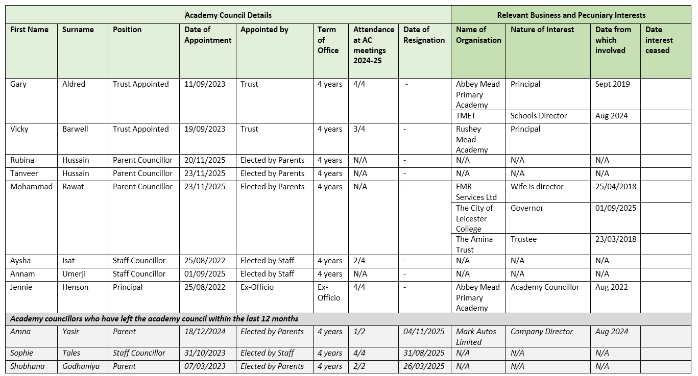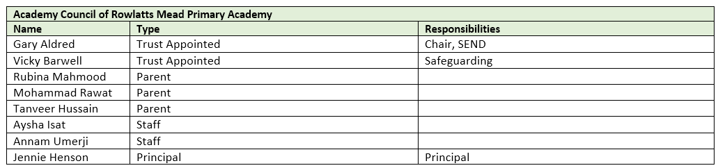 The Academy Council holds the Principal and school senior leadership team to account for the educational performance of the school and its pupils.