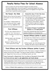 - If your child has an absence of 20 days or more, the Local Authority has advised that a Penalty Notice is unlikely to be issued and the matter is likely to proceed to the Magistrates’ Court for prosecution action instead. The Local Authority has advised that where a parent is found guilty, or where the case is proven against the parent, that this is likely to result in a fine (up to £2500 per parent, per child) and the parent receiving a criminal record. This is because parents have a legal duty to ensure their child attends school where they are on roll regularly.